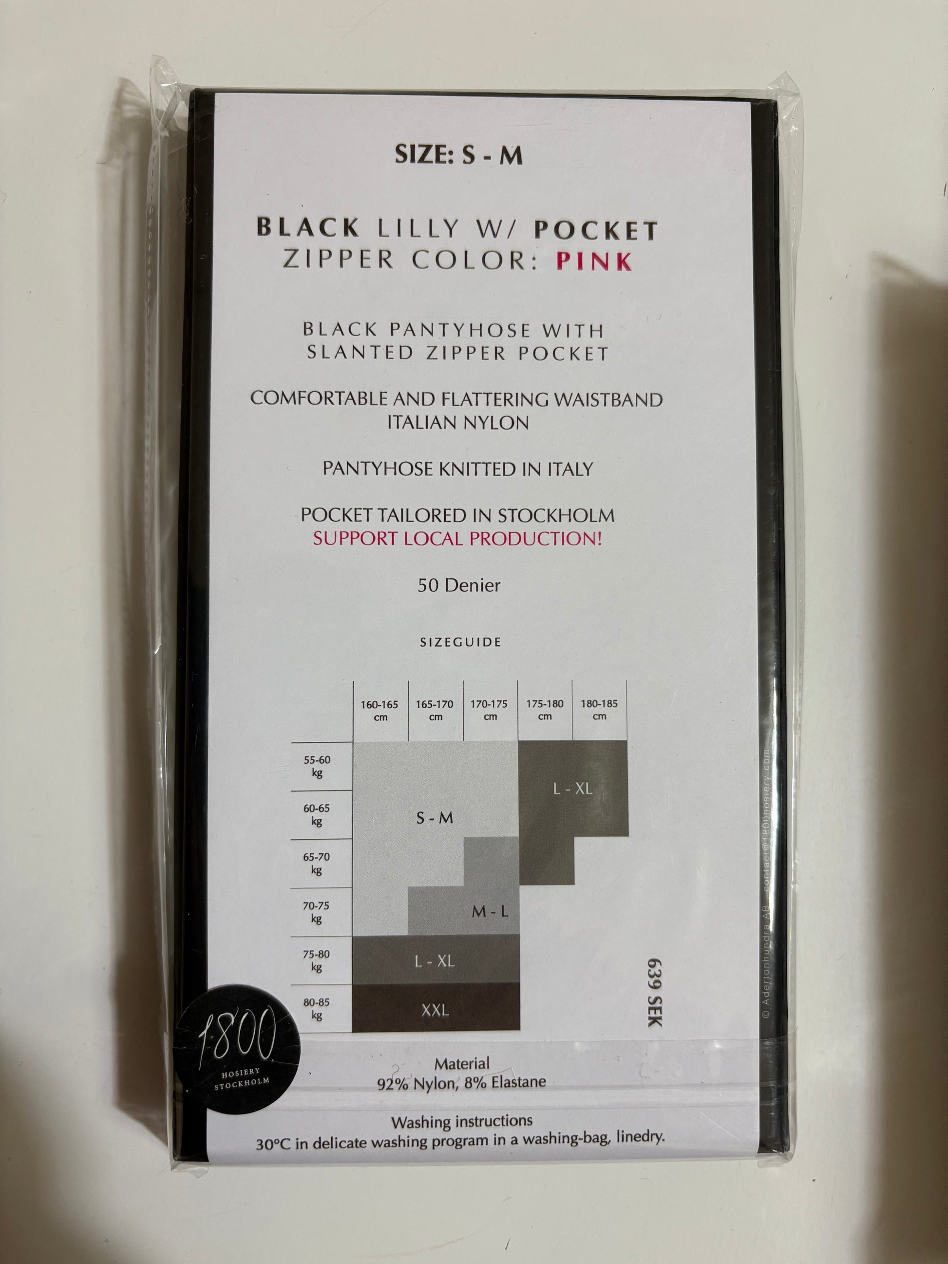 1 pair of black pantyhose with wide waistband with a slanted zipperpocket in the waistband, the zipper is PINK. 50 Den.