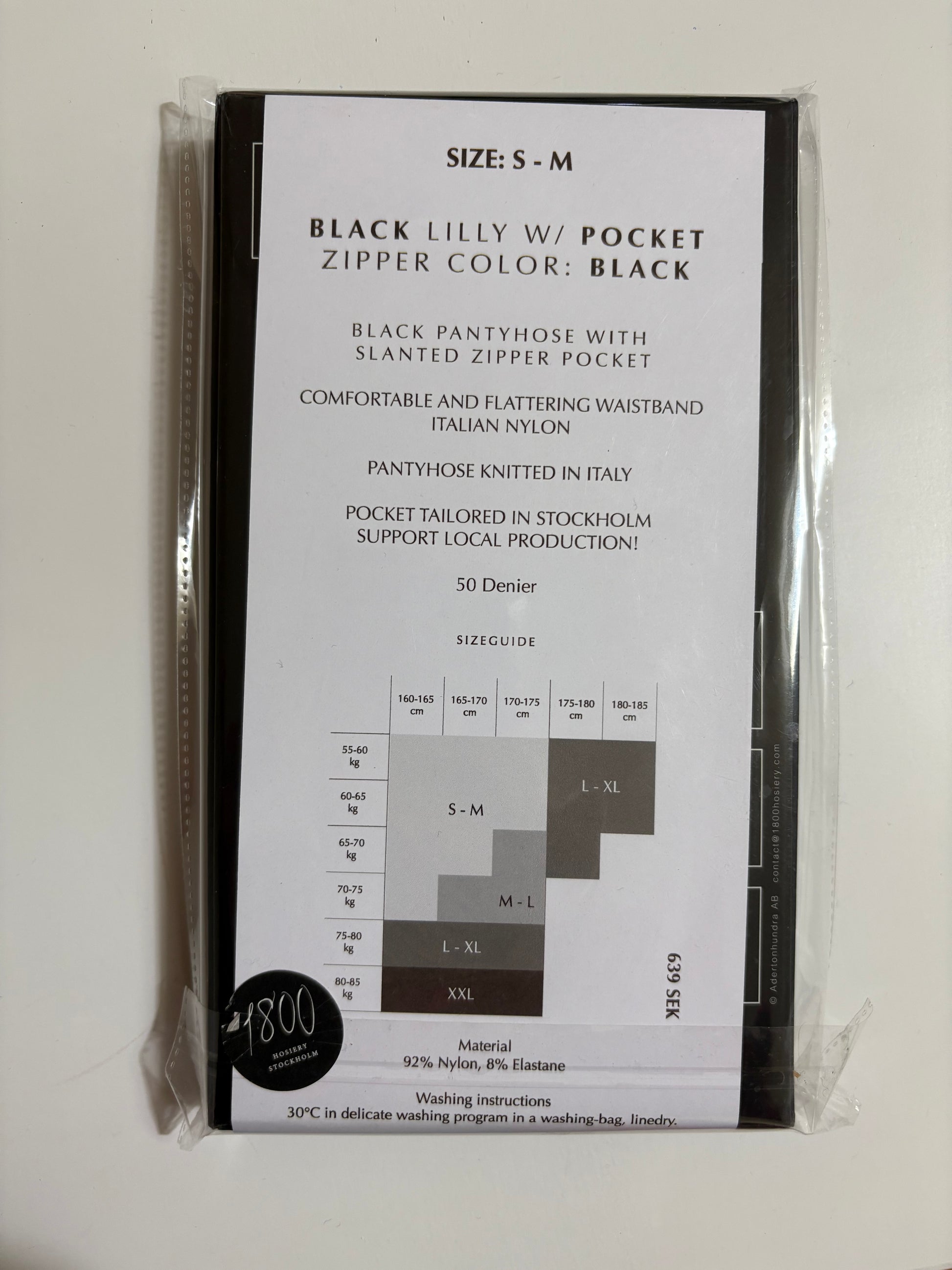 1 pair of black pantyhose with wide waistband with a slanted zipperpocket in the waistband. 50 Den.