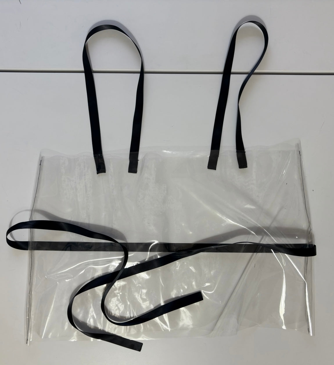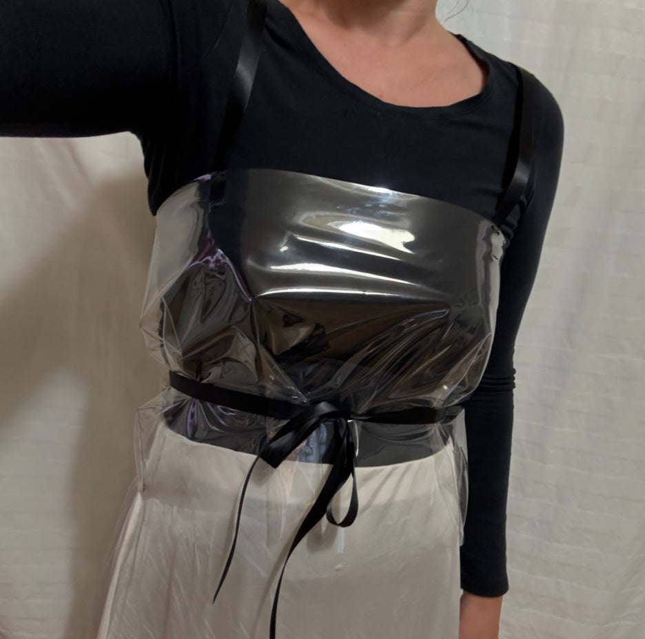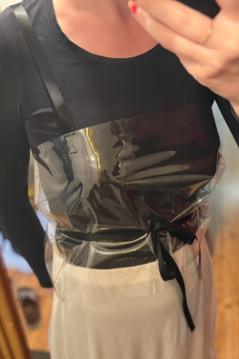 for when you want to feel like a flower wrapped in cellophane, or just want a waterproof layer, this top has you covered. made in clear plastic with black ribbon shoulderstaps and waistband.