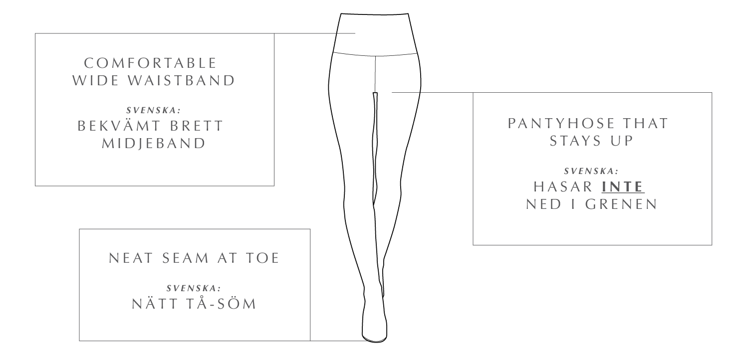 Strumpbyxorna är skapade för att vara bekväma och följa kroppens naturliga form utan att trycka eller skära in. Man slipper det lilla vecket i midjan som man får av traditionella strumpbyx-midjor, så de passar jättebra om man ska ha en tight klänning. Perfekta strumpbyxor till vardag, jobb och fest.