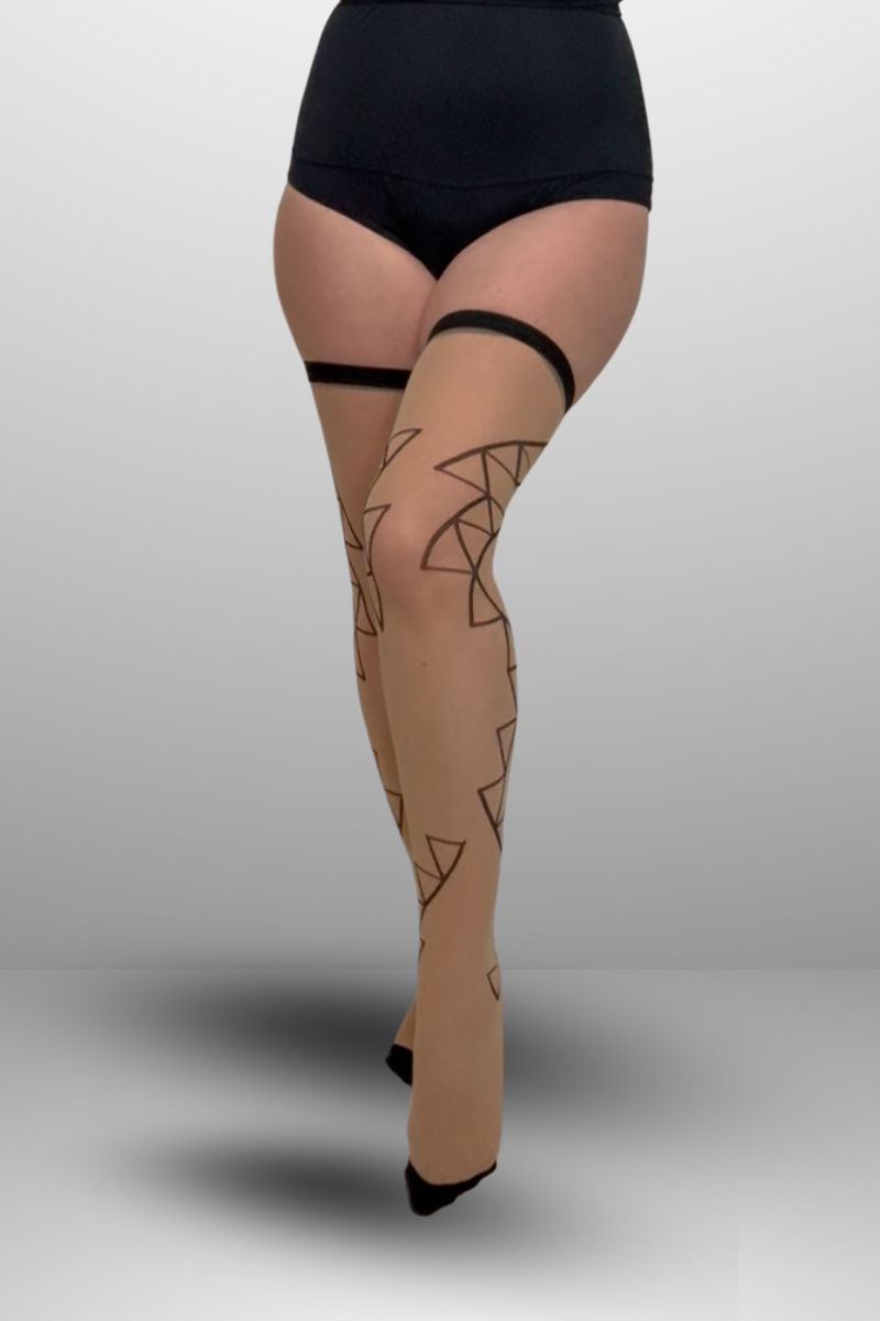 Strumporna är lår-höga och har en benöppning med svart resår med silikon på insidan för att sitta på plats. Det svarta mönstret är jacquardstickat i strumpan, så man känner mönstret som upphöjt när man drar med handen över benet, (väldigt trevligt om man är taktil av sig).Tårna är svarta och förstärkta.